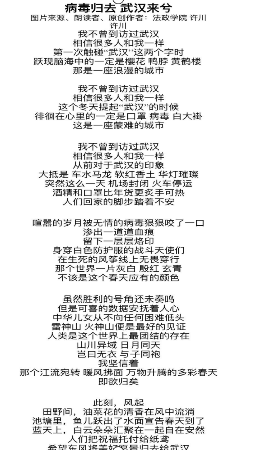 法政学院创新志愿服务方式,创作原创诗歌作品《病毒归去武汉来兮》,并配以诗朗诵的形式,用文字叙说疫情中的感人和力量,用声音表达抗击疫情的决心。预备党员胡平同学响应国家号召,积极参与了社区战疫情志愿者服务活动。他主要负责对出入小区的人员进行健康监测,记录人员流动等。(通讯员:陈翩)