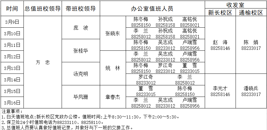 3月9日-3月16日学校总值班安排表