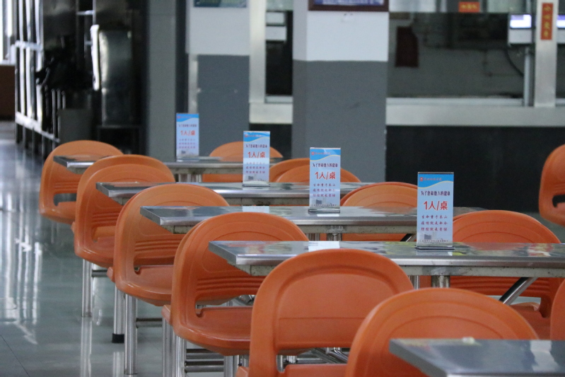 为了应对学生开学后的疫情防控要求,学校在教室、宿舍、食堂窗口等公共设施前都设立了一米等待线。学校食堂前的洗手池足量配备洗手液、擦手纸巾,设置醒目标识和引导牌提醒师生餐前洗手;推行分时错峰供餐制;鼓励师生自带餐具,足量准备一次性打包餐盒;师生员工就餐一人一桌,至少间隔1米以上;餐桌坐满后,后勤工作人员将引导师生将饭菜打包带回宿舍或办公室就餐。