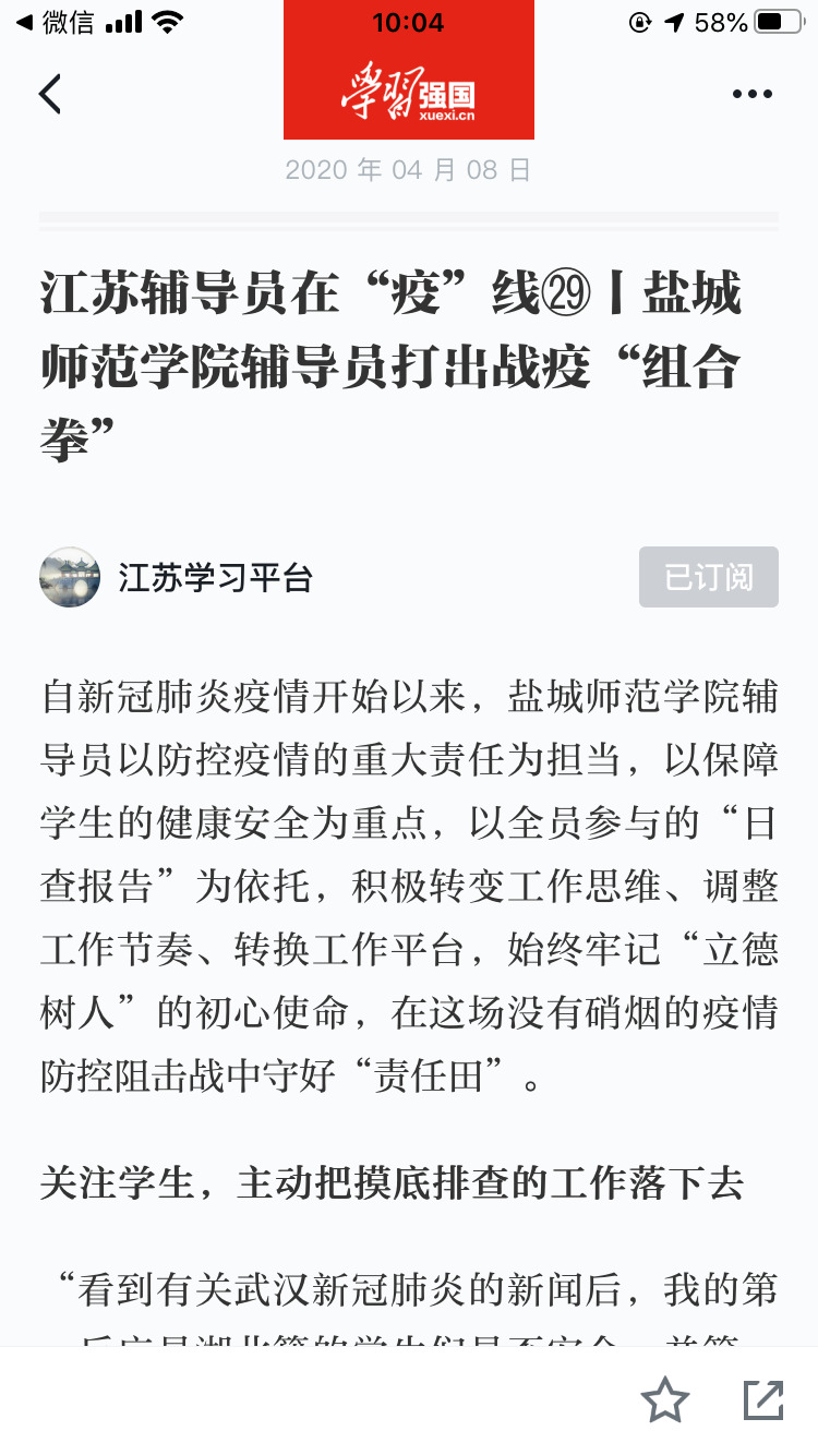 4月8日,学习强国江苏学习平台报道伟德官网辅导员在疫情防控时期,始终牢记“立德树人”初心使命,围绕学生,全力以赴把各项工作做实做细做到位。