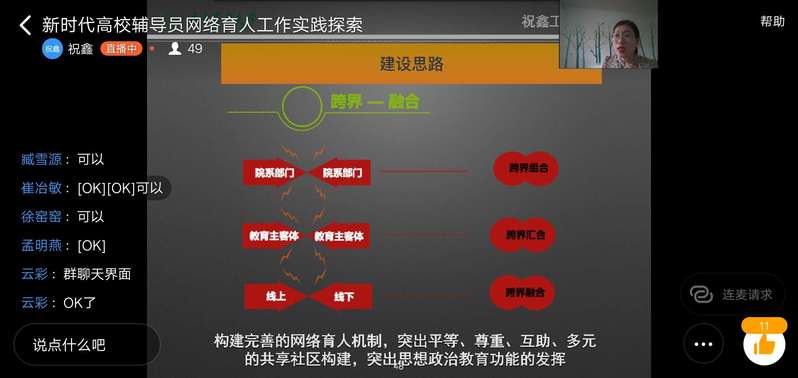 据悉,为进一步加强辅导员队伍建设,提升学生工作育人水平,学生工作处制定了“五个高质量工程”辅导员培训计划。本学期,已围绕主题陆续开展了沙龙五期,后一阶段,学生工作处将继续举办线上专题辅导员沙龙研讨辅导员如何做好科研、辅导员如何开展高质量理论宣讲等工作。