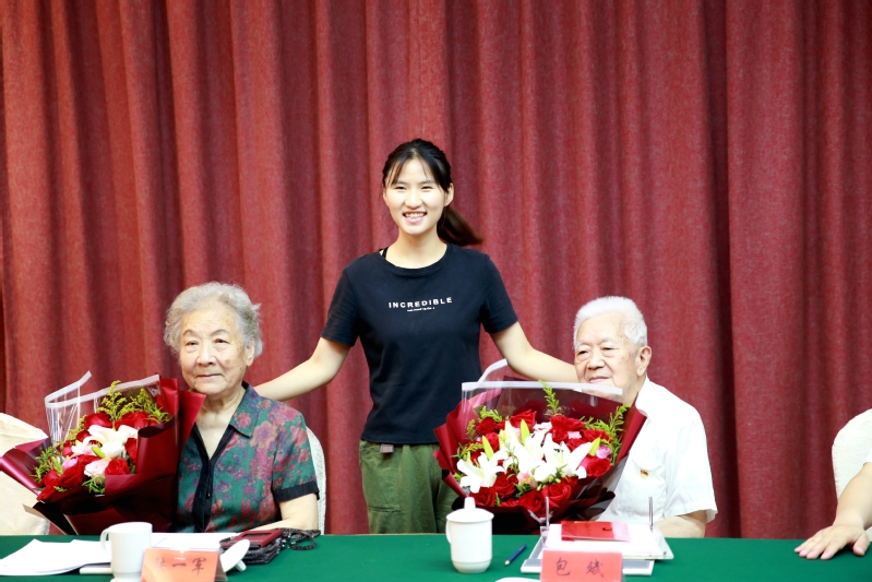 毕凤珊与包斌、陆一军夫妇签订了捐赠协议书并颁发捐赠证书,受资助学生代表海洋与生物工程学院大三学生滕建蓉向二位老人献花。