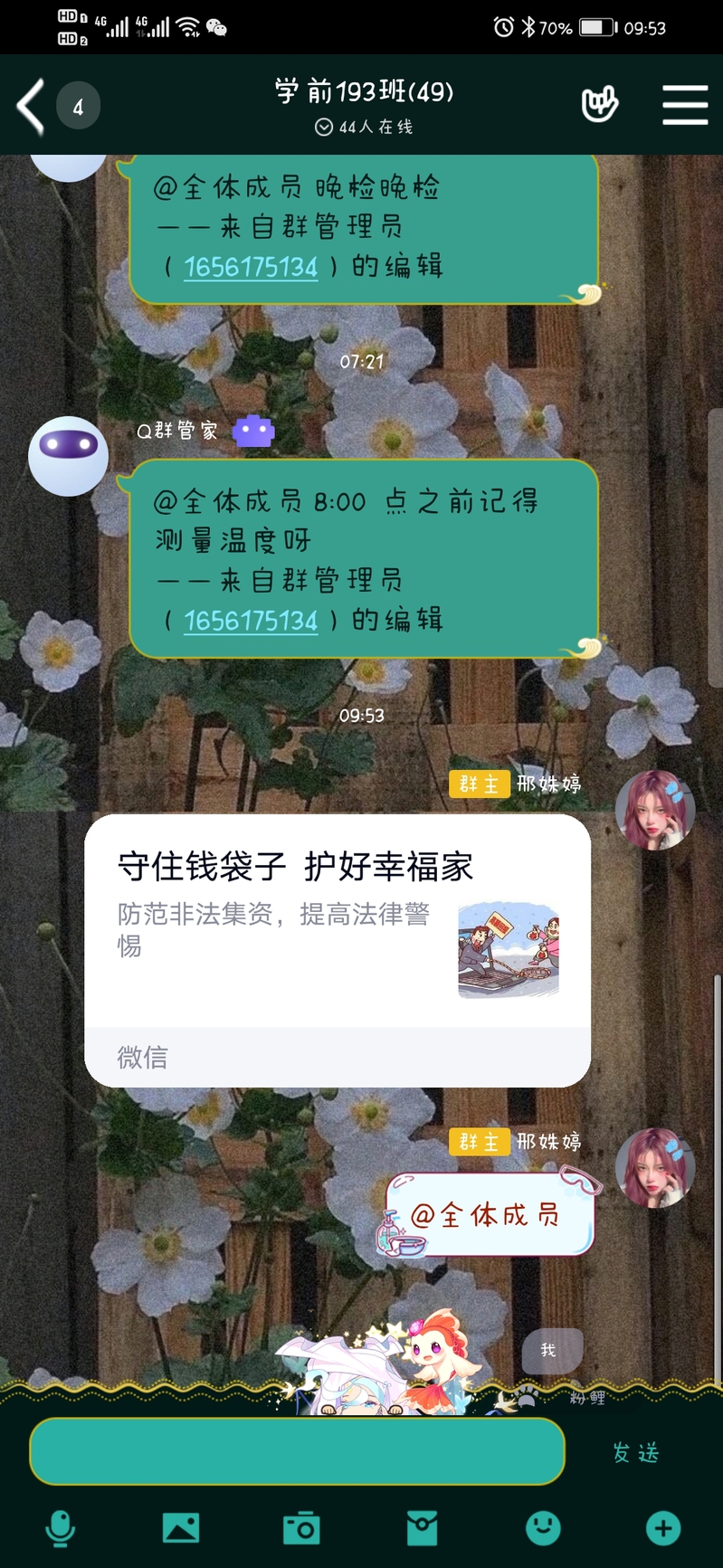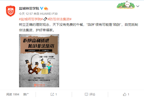 活动期间,学校利用电子屏幕持续滚动播放“远离非法集资,享受美好生活”、“珍重父母血汗辛劳,珍惜大学读书时光,珍爱人生信用”等宣传标语和公益广告;在学校醒目位置设立防范非法集资咨询台、张贴警示海报、提供公益宣传资料;通过学校微信公众号、学工QQ群和微信群推送专题教育宣传内容,结合学生中容易出现的“不良校园贷”“分期购”等问题开展了重点教育,确保不漏掉一个学生,增强活动的实效。