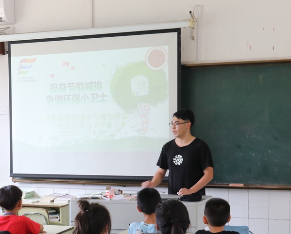 7月6日,城市与规划学院4名大学生志愿者走进乡村小学,开展了“全民投身节能减排 共享绿色美好未来”为主题的社会实践活动。活动中,志愿者们通过PPT展示、演讲、教学提问互动等形式,使孩子们了解了节能减排的意义。在讲解的过程中,志愿者们不时的与孩子们进行互动,通过通俗易懂、生动活泼的讲授方式,让孩子们在轻松的氛围中掌握了节能减排的生活小妙招。