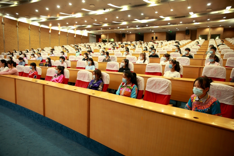 2019级预科生文科班吴钰涵同学代表高年级学生发言。她向学弟学妹们分享了过去一年预科生活的心路历程和学习经验,告诉学弟学妹们大学是一个充满挑战的地方,需要我们高度自觉、自律、自主的学习。杨棉妃同学代表全体2020级预科新生发言。她感谢盐师让来自17个少数民族的93名学生共同携起手来,怀着对祖国最深的挚爱,踏上青春奋斗的新征程。