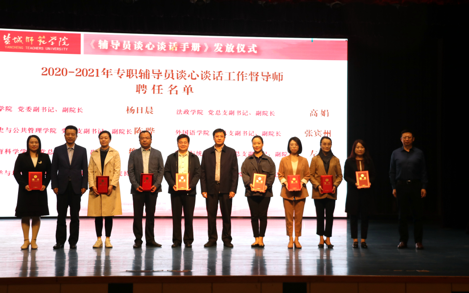 理论宣讲比赛开始前,党委常委、副校长张桂华及相关领导为首批聘任的辅导员谈心谈话工作督导师颁发聘书,给辅导员代表发放《辅导员谈心谈话工作手册》。