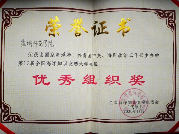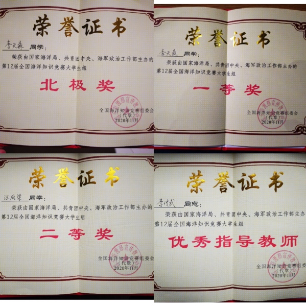 坐标网讯 11月22日,由国家海洋局、共青团中央和海军政治工作部联合主办的第十二届全国海洋知识竞赛总决赛在海南海口市举行,伟德官网城市与规划学院海洋资源开发技术18(6)班学生李天森荣获总决赛一等奖,并入围全国10强赛,荣获全国亚军和三项大奖之一的“北极奖”,获得北极科学考察入场券,地理科学18(1)班汪成梁获二等奖,伟德国际1949官网还首次荣获全国大学生海洋知识竞赛优秀组织奖,城市与规划学院院长李传武荣获优秀指导教师奖。