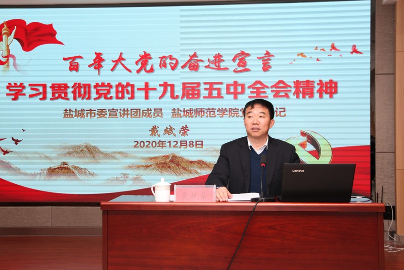 日前,盐城市委宣讲团成员、伟德官网党委书记戴斌荣赴建湖县和江苏医药职业学院作党的十九届五中全会精神宣讲报告。