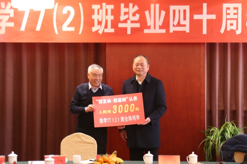 会上,数统院院长姜海波简要介绍了数统院的办学情况。校友办向校友们赠送了代表盐师校友身份的校友徽章。数学77(2)班校友们认养了一棵班级树并寄语“不忘师恩,永念母校”,表达了校友们对母校、恩师深切的敬意和爱意。会后,大家合影留念。