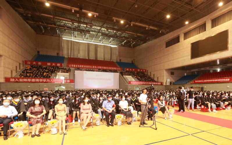 “再见,盐师!”“盐师,我爱你!”礼毕,体育馆里响起了毕业生的呐喊声,此起彼伏,蕴含着毕业生对母校的热爱和对即将告别大学生活的不舍。