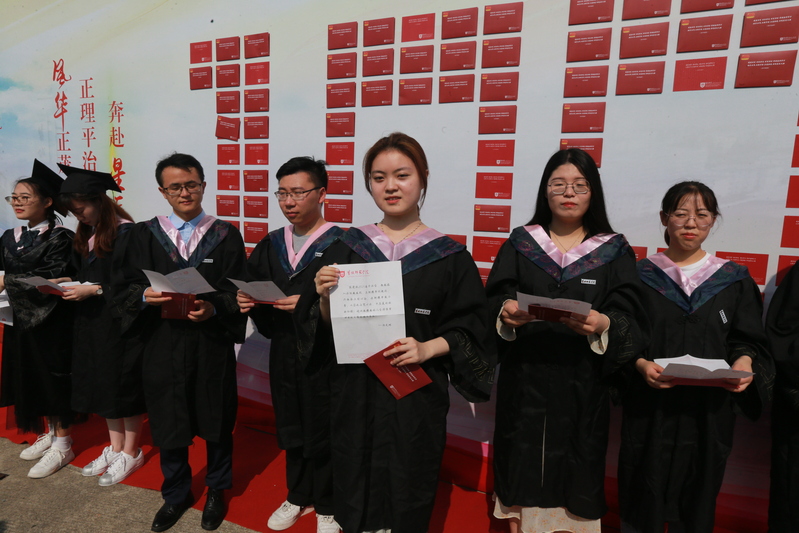 党委书记戴斌荣(左一),党委副书记、校长方忠(左二)等校领导为毕业生代表授予学位