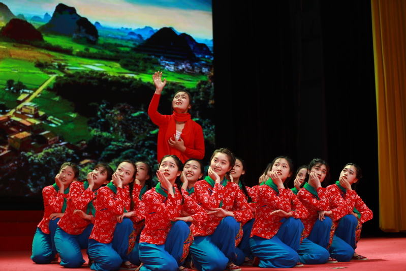 演出现场特别设置了拉歌环节。作为整场演出的前奏,耳熟能详的红色经典歌曲以其强烈的感染力和独特的表现力带领在场师生穿越时空,重温历史。大家纷纷响应,接力唱响红色赞歌。《东方红》《唱支山歌给党听》《太阳最红,毛主席最亲》《我的中国心》等歌曲轮番上演,激荡人心,展现了新时代青年爱党、爱国、爱社会主义的真挚情感和为实现中华民族伟大复兴中国梦而不懈奋斗的壮志豪情。