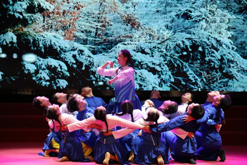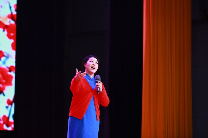 在《庆典序曲》热烈欢快的乐声中,整场演出拉开帷幕 。永远跟党走,源于历经岁月洗礼而永不褪色的初心。舞蹈《沁园春·雪》通过展现大气磅礴的北国风光,表达了对祖国壮丽河山的深情礼赞和革命浪漫主义情怀;女声独唱《红梅赞》深情歌颂了革命先辈们凌霜傲雪、坚贞不屈的精神气节;情景朗诵《红灯记》通过对经典剧目进行艺术手法和表达方式的转化,呈现了共产党人与敌斗争的智慧和勇毅。永远跟党走,蕴含深厚的爱国主义情怀。诗朗诵《可爱的中国》将师生带入无产阶级革命家方志敏的精神世界,远隔辽阔的时空,那份对党和国家的忠诚与热血依然真挚而炽热、熠熠生辉;独唱《母亲河》节奏明快、清新悠扬,寄托了对祖国的深情眷恋;舞蹈《一条大河》《黄河》展现了中华儿女反抗侵略、保家卫国的壮志豪情;独唱《党啊,亲爱的妈妈》《祖国之恋》以优美的旋律,表达了对党的感恩、对祖国繁荣富强的欢欣鼓舞和美好祝愿。永远跟党走,是将人生理想与国家命运紧紧相连,接续奋进之路。诗朗诵《美德之花》讲述了离休教师包斌、陆一军夫妇以凡人善举诠释大爱无疆,省吃俭用、捐资百万助学的感人事迹;舞蹈《风筝》以充满童趣、饱含深情的表演展现了乡村教师对故乡的牵挂以及为教育事业奉献一生的决心;独唱《我为祖国献石油》表现了石油工人积极投身社会主义建设的豪迈气概;舞蹈《我等你》演绎了等待丈夫平安归来的军嫂的坚强和无悔,令人感受到质朴深厚的家国情怀。