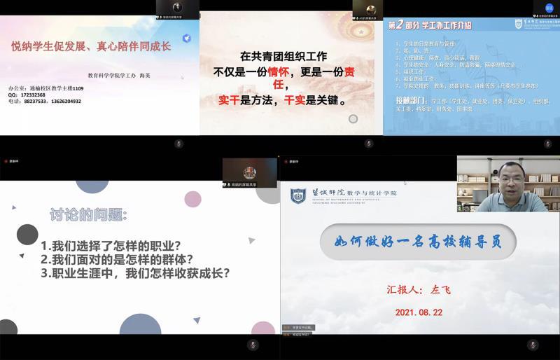 8月22日至27日,党委学工部、学生工作处组织2021年新入职辅导员接受线上岗前业务培训。本次培训围绕辅导员职业能力要求和成长发展需要,通过校内外专家专题报告、工作研讨交流、工作实务介绍等多种形式,助力新入职辅导员迅速完成角色转变,明确工作岗位要求,提升理论素养和职业能力。
