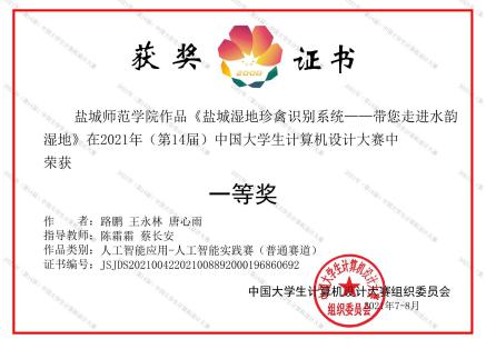 1 | 盐城湿地珍禽识别系统 | 路鹏、王永林、唐心雨 | 陈霜霜、蔡长安 | 信息工程学院 | 国一等奖 |