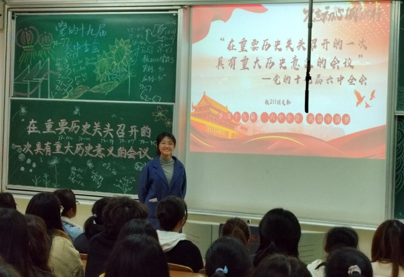 教育科学学院8个党支部利用11月党日活动集中开展全会精神学习,组织观看视频资料、学习文件、讨论交流,完成“学习强国”专项答题,43个团支部组织学习党的十九届六中全会精神主题团日活动。