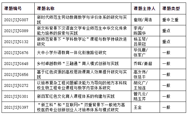 近日,江苏省高等教育学会发布了《关于公布2021年江苏省高等教育教改研究立项课题评选结果的通知》(苏高教会〔2021〕42号),伟德官网有9项课题获批立项,重中之重课题1项、重点课题2项、一般课题6项。其中由崔刚、周浩主持的“新时代师范生劳动教育教学与评价体系的研究与实践”获批立项重中之重项目,重点项目立项数和立项总数均居全省同层次高校前列。