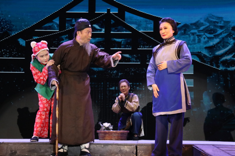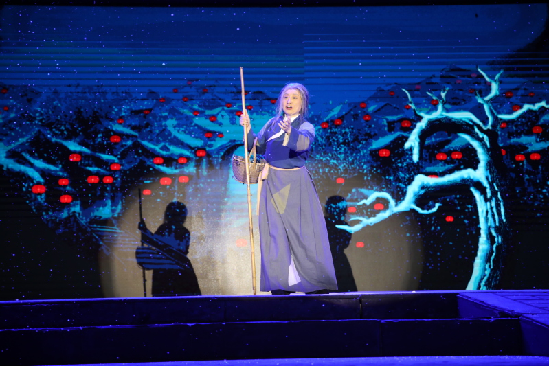 该剧改编自鲁迅先生小说《祝福》,是江苏省淮剧团最具代表性的剧目之一。该剧以主角祥林嫂的遭遇为线索,讲述了一个封建社会底层妇女的悲惨命运。在保留小说主题、人物和情节的大框架下,淮剧《祥林嫂》大胆生发出“卖福人”“贺老六搭救祥林嫂逃出大山”“洞房邂逅”等新的细节,使主题更具有反讽意味,人物情感历程更加丰满。