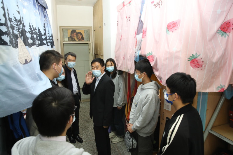 在通榆校区,学校党委常委、副校长崔刚、张桂华,党委常委、纪委书记、省监委派驻监察专员韩雅丽一行先后来到学校西大门、北苑食堂慰问值班在岗人员,对他们的辛勤劳动表示感谢。崔刚、张桂华、韩雅丽一行还来到数学与统计学院、体育学院的学生宿舍看望同学,详细了解他们学习、生活、就业的情况,希望广大同学理解、支持、执行学校的疫情防控规定,齐心协力、众志成城,共克时艰。