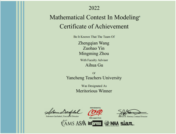 据悉,美国大学生数学建模竞赛(MCM/ICM)是最著名的国际大学生竞赛之一,是数学建模领域的国际性权威赛事,由美国数学及其应用协会主办,美国数学学会、运筹学学会、工业与应用数学学会等多家机构协办。竞赛分为数学建模竞赛(MCM)和交叉学科数学建模竞赛(ICM),分别各有3个题目供参赛队伍选择。2022年MCM/ICM竞赛有中国、美国、澳大利亚、加拿大、英国等国家和地区的近3万支队伍参加,参赛学校包括牛津大学、科罗拉多大学、复旦大学、西安交通大学等国内外知名大学。竞赛奖项设立6个等级,分别为OutstandingWinner(简称O奖或特等奖:0.14%)、FinalistWinner(简称F奖或特等提名奖:0.17%)、MeritoriousWinner(简称M奖或一等奖:6%)、HonorableMention(简称H奖或二等奖:26%)、SuccessfulParticipant(S奖或三等奖)和UnsuccessfulParticipant(未成功参赛)。