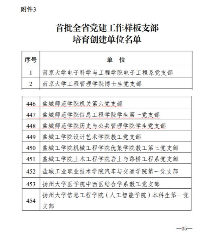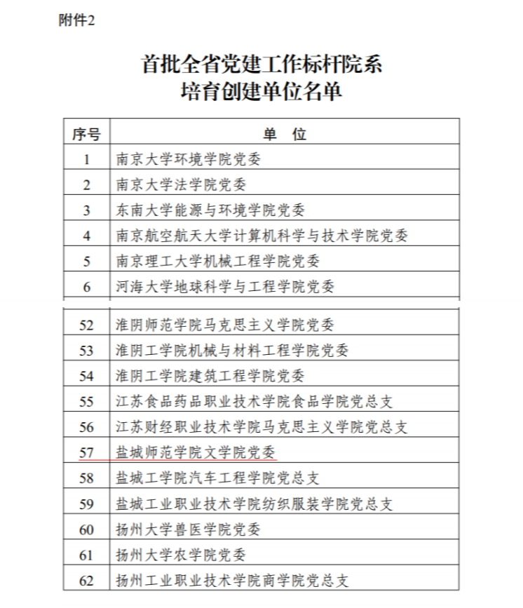 近日,江苏省委教育工委公布了首批全省党建工作示范高校、标杆院系、样板支部培育创建单位名单。伟德官网遴选报送的文学院党委入选首批“全省党建工作标杆院系”培育创建单位,机关第六党支部、信息工程学院学生第一党支部、历史与公共管理学院学生党支部等3个基层党支部入选首批“全省党建工作样板支部”培育创建单位。这是继法政学院教师第一党支部(现马克思主义学院教师第一党支部)、离退休教职工第七党支部、教育科学学院教工第三党支部入选全国党建工作样板支部后,伟德官网党建工作取得的新突破。