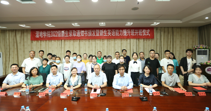方忠现场为湿地学院新同学代表颁发录取通知书。唐伯平和学校招生就业处处长刘海燕为“湿地学院新生英语能力提升班”揭牌。