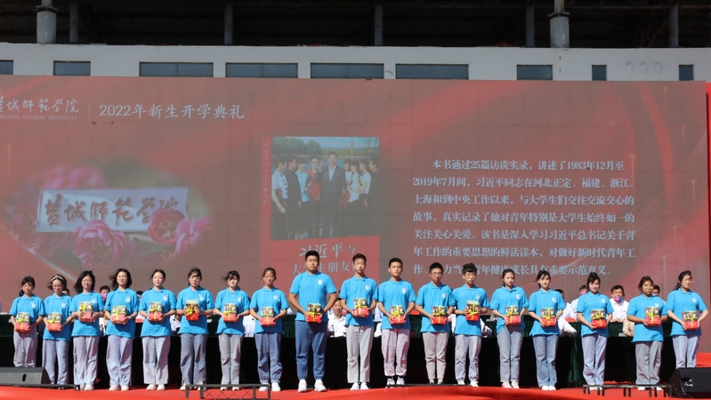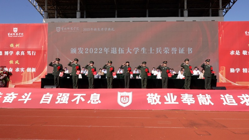 典礼伊始,校领导向9位积极响应国家号召携笔从戎、报效祖国,用热血书写无悔青春的2022年退役返校大学生士兵代表颁发荣誉证书。典礼上,校领导还向2022级新生代表赠送书籍《习近平与大学生朋友们》,为他们佩戴伟德国际1949官网校徽,祝贺他们成为新“盐师人”。