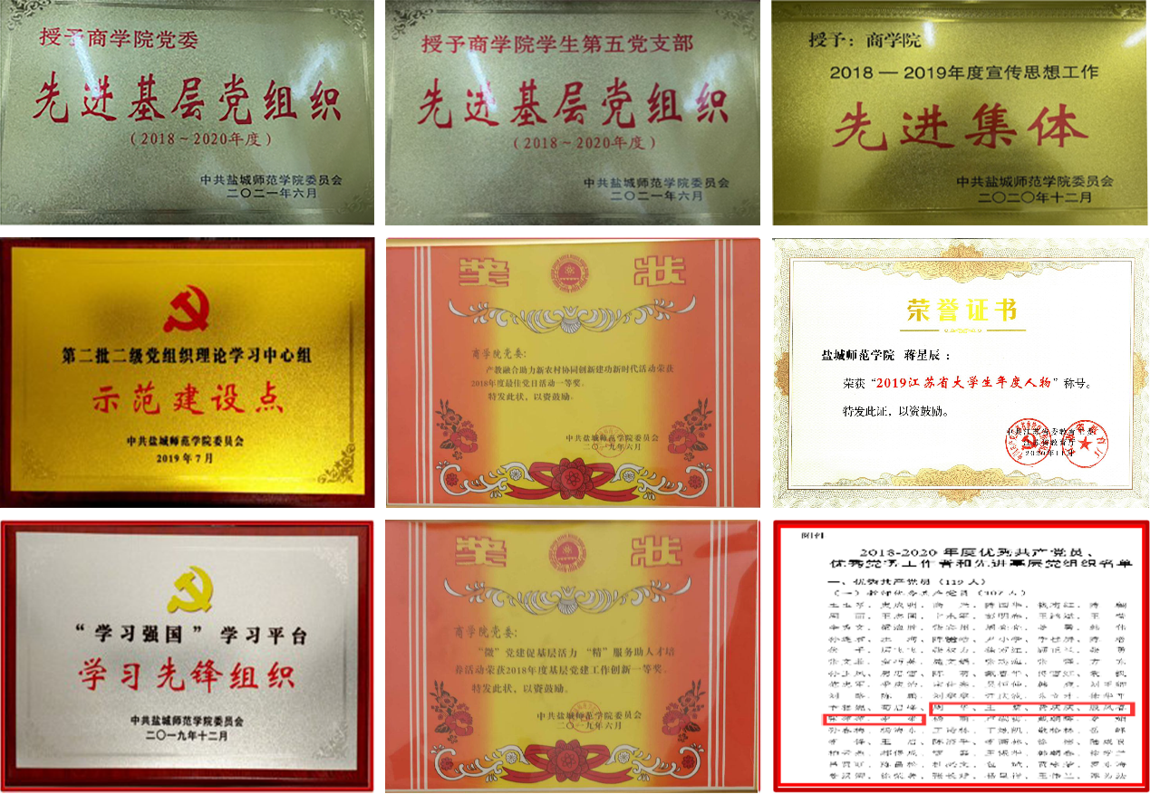 通过“不忘初心、牢记使命”主题教育和党史学习教育,主动对标争先、强基创优。四年来,学院党委先后荣获校先进基层党组织、校基层服务型党组织示范点创建单位、理论中心组学习示范建设点、“学习强国”平台学习先进集体、宣传思想工作先进集体。深入实施“一个总支一个特色、一个支部一个亮点”工程,强化基层党组织建设,获批校“书记项目”重点项目4项。基层党建工作创新奖特等奖1个、一等奖1个、二等奖2个;最佳党日活动特等奖1个、一等奖1个、二等奖2个,发表省级以上党建论文15篇。1个党支部获校2020年“双带头人”教师党支部书记工作室创建单位,2个支部获评校优质党支部。涌现出一批先进典型和先锋模范。我院杰出校友包斌、陆一军夫妇获第七届全国道德模范提名奖,纪峰同志被表彰为盐城市“文明职工”,林小兰同志、殷凤春同志分别获得2020年、2021年省教育基金会颁发的“高尚师德”奖教金。范华莉同志获“盐城市创建全国文明城市先进个人”。学生党员蒋星辰荣获“2019江苏省大学生年度人物”,系伟德官网首次获此殊荣。