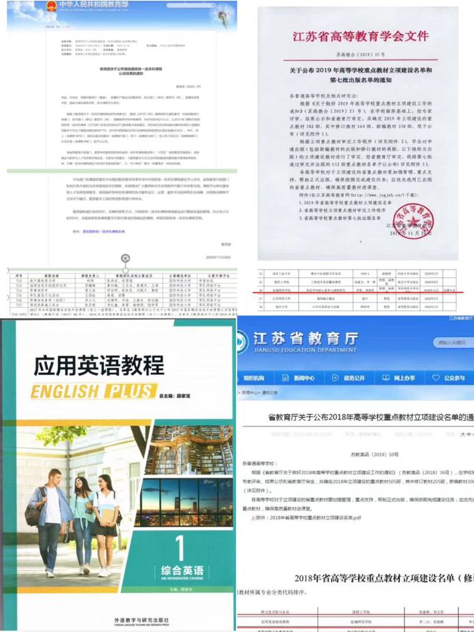课程开发,成效显著。“英美诗歌”获批国家级一流本科课程,“美国文学”和“英语课程与教学论”获批省一流本科课程。《应用英语教程》《基于学科核心素养的英语教学课例研究》《翻译理论与实践教程》等省重点教材相继出版。成立外语类课程思政教学与研究中心,建成示范课程8门。与盐城中学等学校共建教学案例库9个,出版教材3部;与外研社、外教社等外语类权威出版社合作建成覆盖核心课程试题库8个。