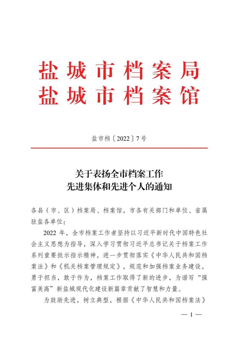 为鼓励先进,树立典型,根据《中华人民共和国档案法》和国家档案局第13号令《机关档案管理规定》相关规定,盐城市档案局、盐城市档案馆对2022年全市档案工作中表现突出的先进集体和先进个人予以表扬。伟德官网档案馆荣获盐城市档案工作先进集体,1人荣获盐城市档案工作先进个人。
