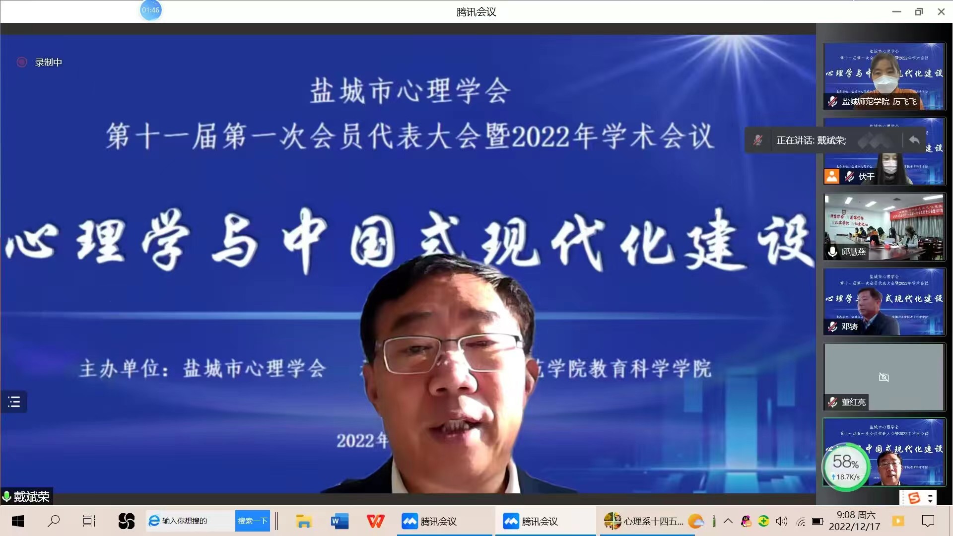 12月17日,由伟德国际1949官网教育科学学院承办的盐城市心理学会第十一届第一次会员代表大会暨2022年学术会议顺利召开,理事候选人和会员大会代表共200多人线上线下参加本次会议。学校党委书记戴斌荣出席开幕式并致辞。