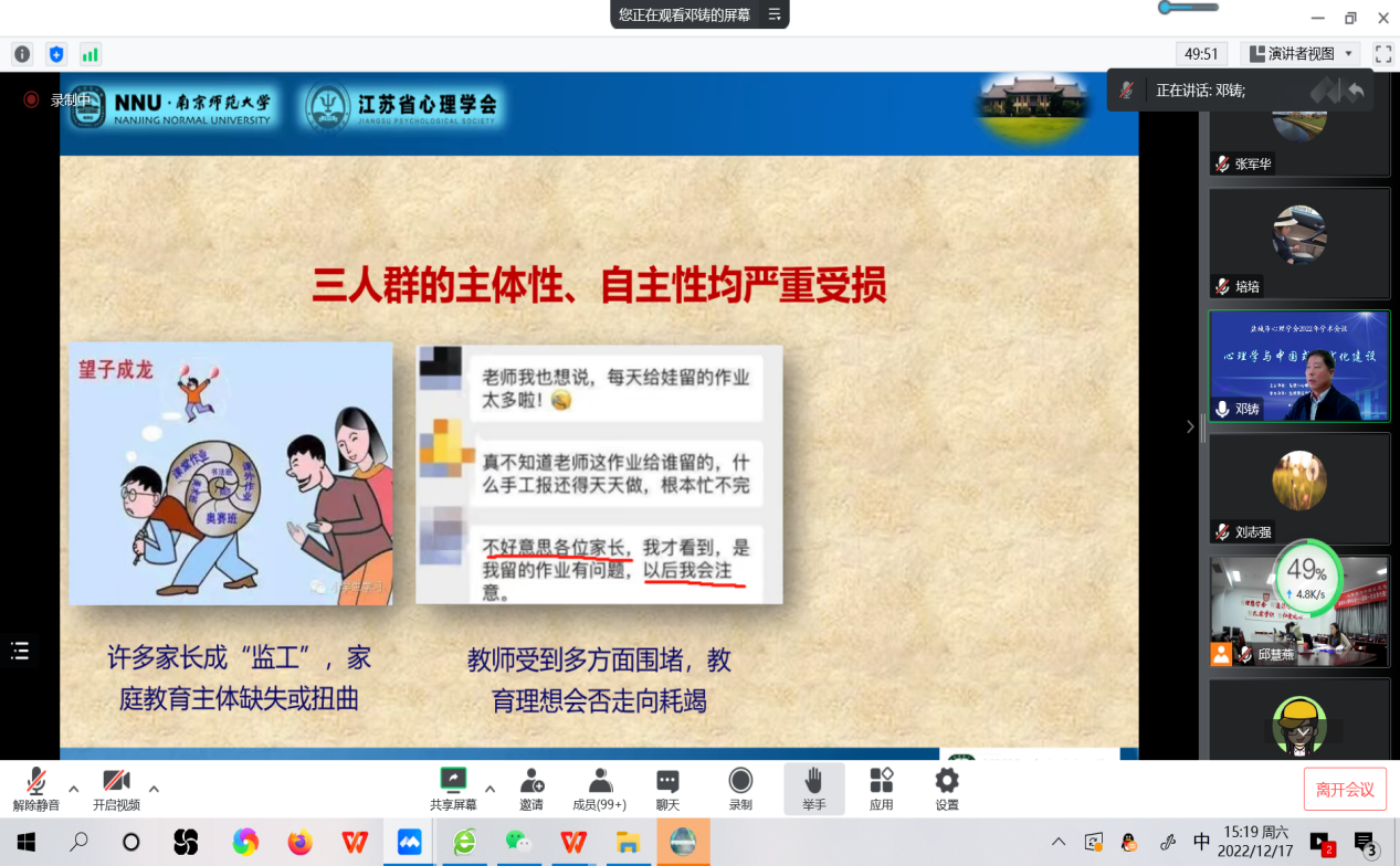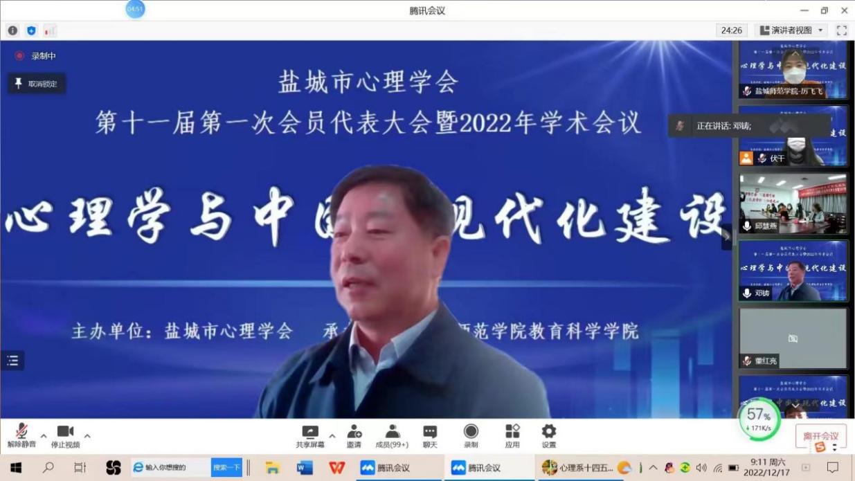 在随后召开的盐城市心理学会2022年学术会议上,江苏省心理学学会理事长邓铸应邀做题为《家校社教育责任的边界——“双减”“家庭教育促进法”与儿童生命健康成长》的学术报告。