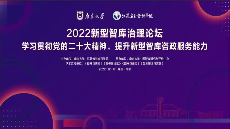 12月18日,由光明日报社和南京大学联合主办的2022年度“新型智库治理论坛”在南京召开。论坛聚焦“学习贯彻党的二十大精神,提升新型智库咨政服务能力”的主题,来自全国智库界、思想理论界专家和智库负责人等700余人线上线下参会。论坛认真学习贯彻党的二十大精神,报告中国特色新型智库的建设进展与先进经验,成果发布环节包括新书发布、CTTI来源智库增补结果、优秀成果推介、高校智库百强榜发布等活动。