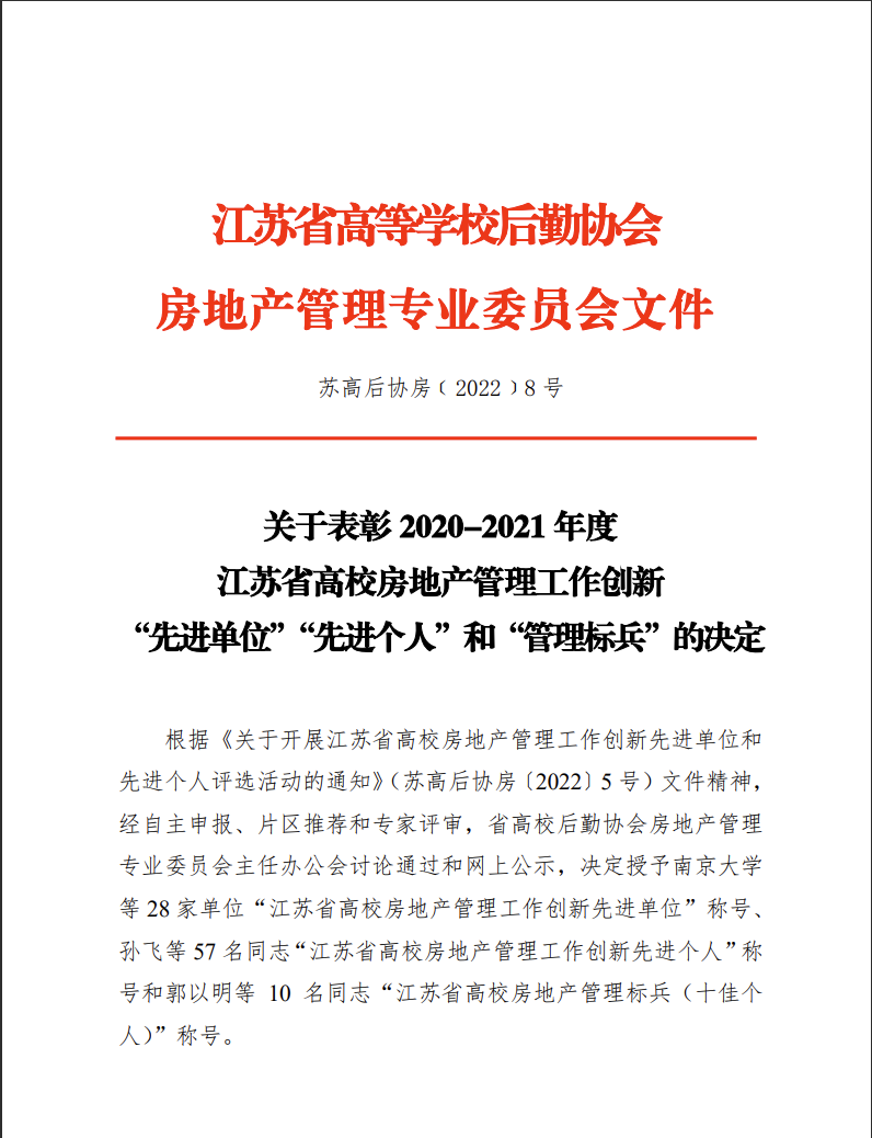 近日,江苏省高等学校后勤协会房地产管理专业委员会发布《关于表彰2020-2021年度江苏省高校房地产管理工作创新“先进单位”“先进个人”和“管理标兵”的决定》,对全省各高校在房地产管理方面涌现出的先进集体和个人进行表彰。伟德官网获评江苏省高校房地产管理工作创新“先进单位”,全省28家高校获此殊荣。