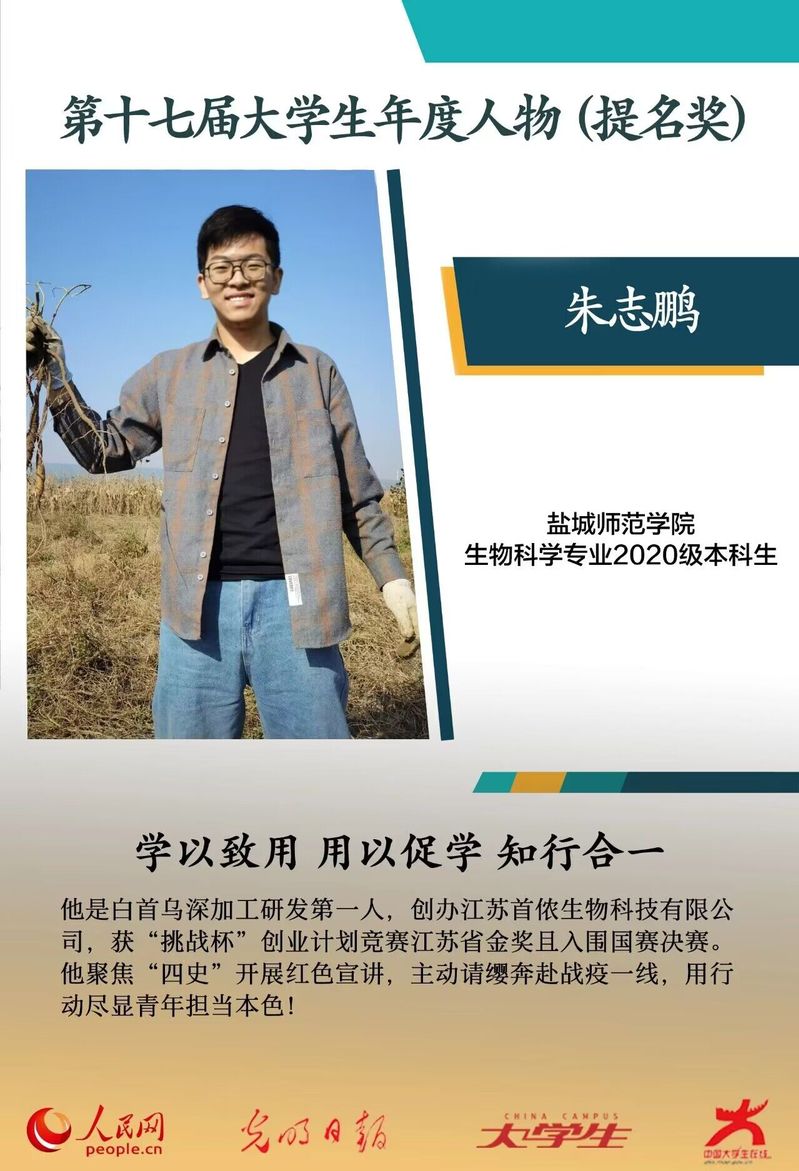 朱志鹏是海生院生物科学(师范)专业2020级本科生,现为校学生会执行主席。他学习刻苦踏实,成绩名列前茅,具有较强的专业理论素养和实践创新能力,曾获国家奖学金,连续4次获得一等奖学金,带领团队发表高水平学术论文7篇,获批国家发明专利6项,创办江苏首侬生物科技有限公司,获“挑战杯”创业计划竞赛江苏省金奖且入围国赛决赛。