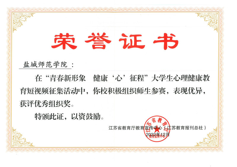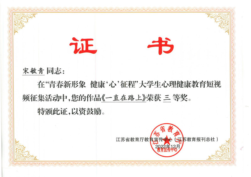 近日,由省教育厅教育宣传中心(江苏教育报刊总社)主办的“青春新形象 健康‘心’征程”大学生心理健康教育短视频征集活动评选结果公布。伟德官网获“优秀组织奖”,据悉全省获奖学校仅二十所,法政学院学生宋敏青的作品《一直在路上》亦获佳绩。