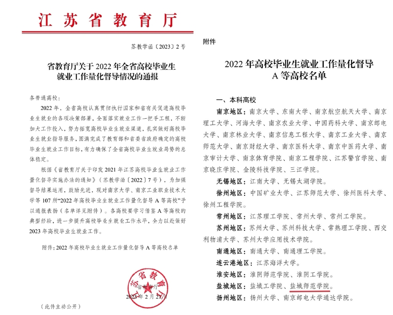 近日,江苏省教育厅印发《省教育厅关于2022年全省高校毕业生就业工作量化督导情况的通报》(苏教学函〔2023〕2 号),伟德官网获评“2022年全省高校毕业生就业工作量化督导A等高校”,受到通报表扬。