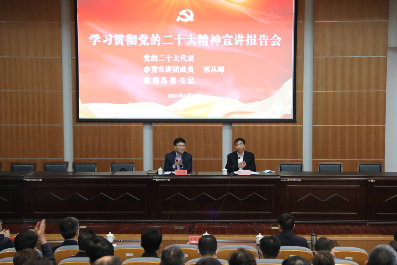 3月10日下午,党的二十大代表、建湖县县委书记祁从峰应邀在伟德官网新长校区图书馆报告厅宣讲党的二十大精神,这是伟德官网处级领导干部学习贯彻党的二十大精神集中轮训的首场校外专家报告会。学校党委书记戴斌荣主持报告会,全体在盐校领导出席报告会,全校处级以上领导干部参加宣讲报告会。
