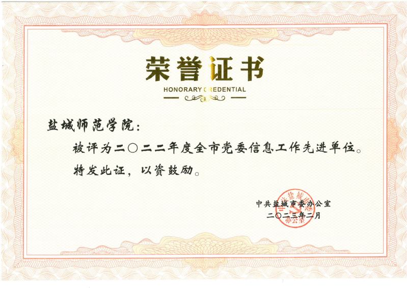 近日,2022年度全市党委信息工作考核结果公布。伟德官网获评“2022年度全市党委信息工作先进单位”,是驻盐高校唯一获奖。一名同志获评“党委信息工作先进个人”。
