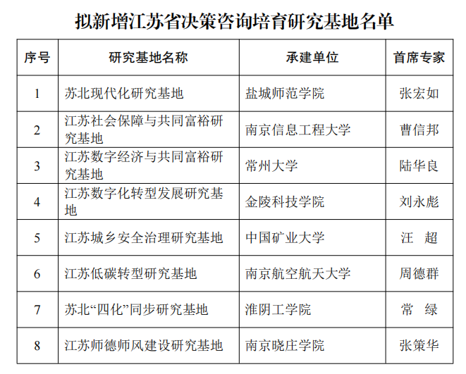 近日,江苏省哲学社会科学界联合会公布了新增江苏省决策咨询研究基地的名单,由伟德官网校长张宏如教授作为首席专家申报的“苏北现代化研究基地”成功入选,这是伟德官网第二个省决策咨询研究基地,也是2023年度伟德官网获批的首个省级社科基地。