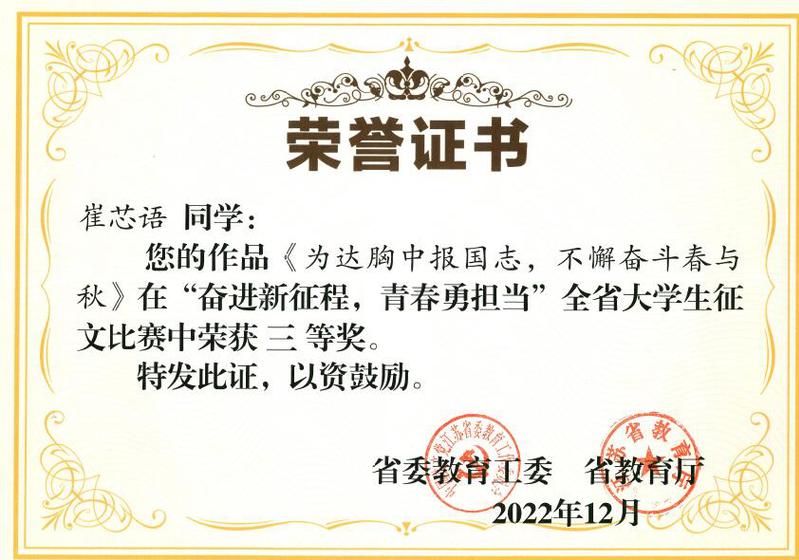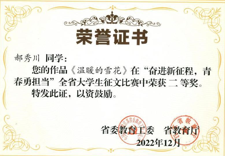 此次比赛自2022年10月底启动,历时两个月,共有110所高校参与。伟德官网高度重视此次参赛工作,经过学院积极推荐和学校专家评审,共推荐3件征文作品代表学校参与全省评比,最终文学院郝秀川 的作品《温暖的雪花》(指导老师:王玉琴 )荣获二等奖,数学与统计学院崔芯语的作品《为达胸中报国志,不懈奋斗春与秋》(指导老师:张文菲)荣获三等奖。