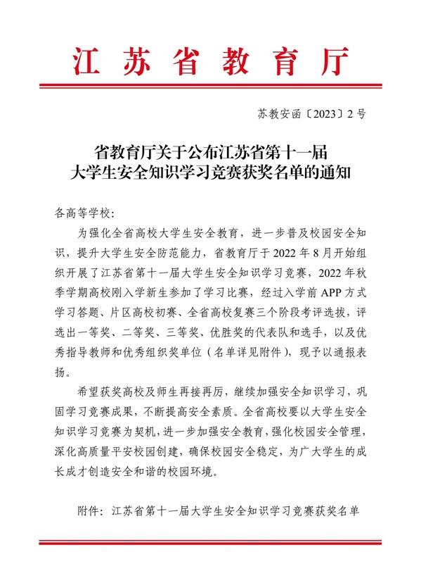 据悉,本次比赛从2022年10月启动,由全省各高校、各片区精心组织,由全省158所高校35万多名新生积极参与,比赛环节分为选拔赛、初赛、复赛(决赛)三个阶段。比赛对提升全省大学生安全知识、安全意识、安全防范能力,促进全省高校创建高质量平安校园,共创平安江苏起到了积极作用。