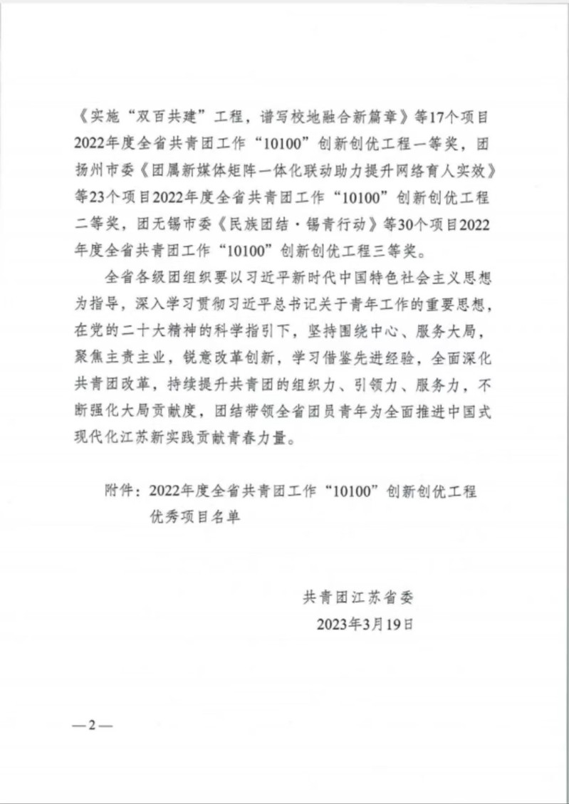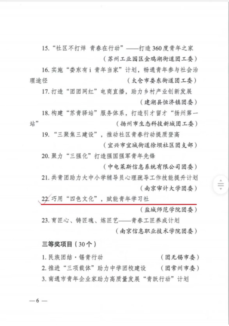近日,共青团江苏省委表彰了2022年度全省共青团工作“10100”创新创优工程优秀项目,伟德官网团委申报的《巧用“四色”文化,赋能青年学习社》项目荣获二等奖,全省受表彰的高校仅有10家。