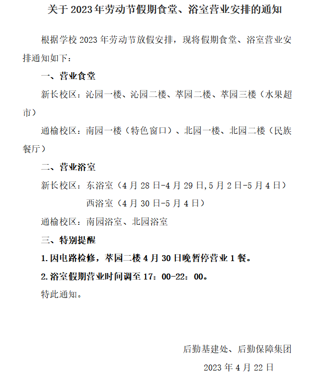 关于2023年劳动节假期食堂、浴室营业安排的通知