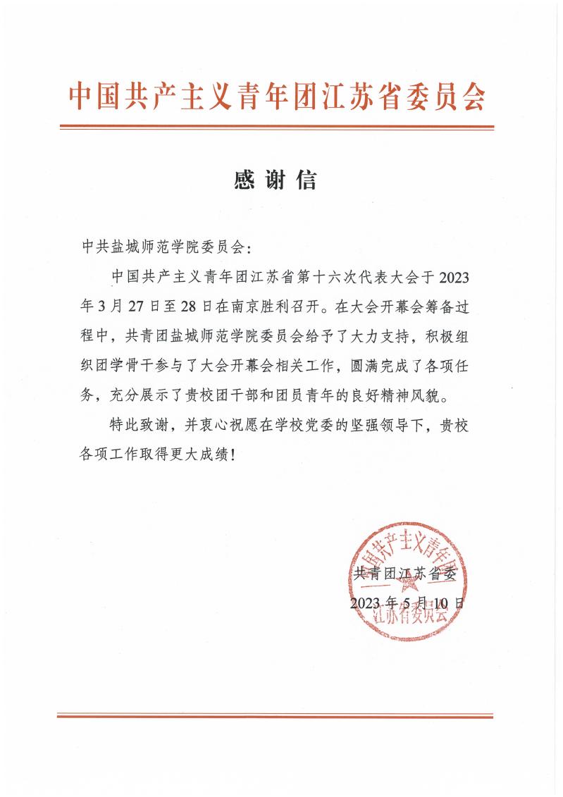 近日,共青团江苏省委向伟德官网发来感谢信,对伟德官网团委在中国共产主义青年团江苏省第十六次代表大会开幕会筹备过程中给予的大力支持表示感谢。