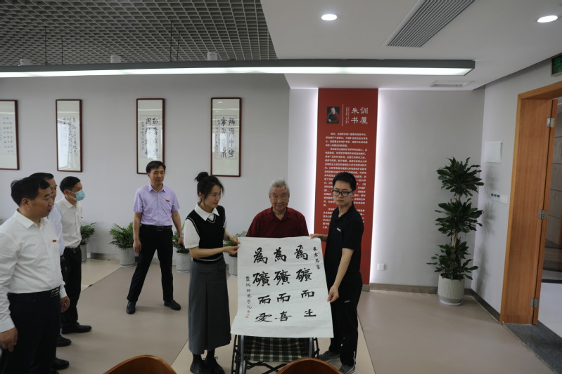 现场学生们纷纷表达对老先生的感动之情,献上鲜花和代表老先生思想的书法作品。城市与规划学院徐其虎老师表示,朱训书屋藏书内容丰富,涉及政治、经济、文化、哲学、地理科学、矿产研究等诸多领域,有丰富的史料和统计资料,对师生开展相关领域研究具有重要的价值。