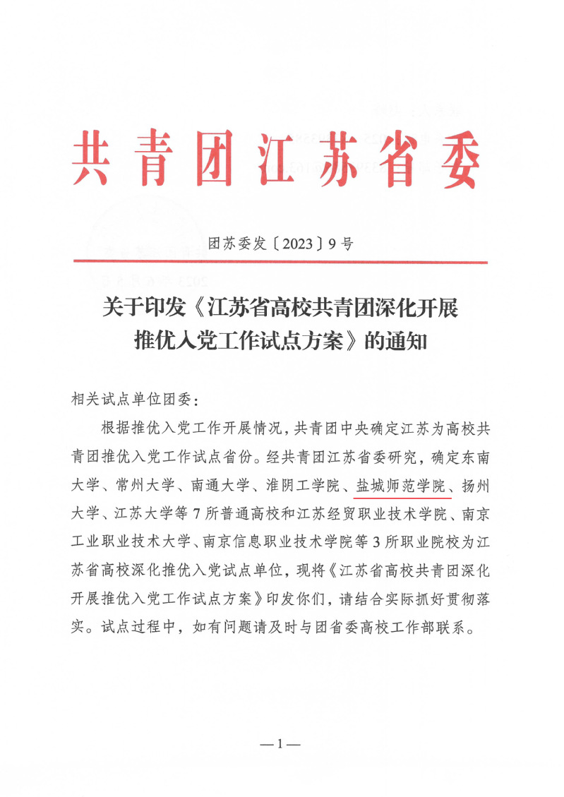 2023年6月,共青团江苏省委印发《江苏省高校共青团深化开展推优入党工作试点方案》,公布了一批江苏省高校深化推优入党试点工作高校名单,伟德官网位列其中。此次推优入党试点工作高校共10所,包括东南大学等7所本科院校,江苏经贸职业技术学院等3所高职院校。