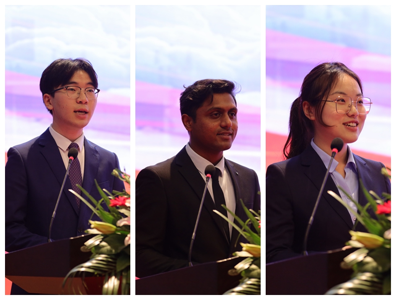 海洋与生物工程学院毕业班班主任、副教授夏文龙老师,江苏省优秀毕业生、2023年江苏省委组织部选调录用者商学院郝俊尧同学,国际教育学院孟加拉国留学生穆巴同学,文学院2021级汉语言文学师范专业本科生任艺同学分别作为教师代表、毕业生代表、留学生代表和在校生代表发言。伟德官网政史系00届校友,上海交通大学体育系主任,博士生导师王坤教授通过视频为毕业生送上毕业祝福。