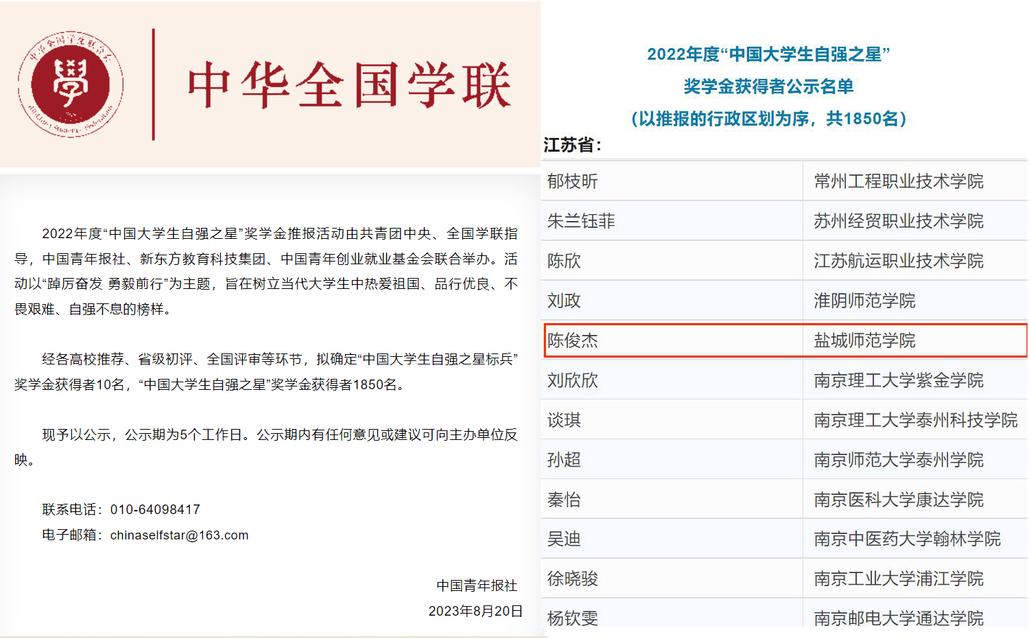 近日,由共青团中央、全国学联指导,中国青年报社、新东方教育科技集团、中国青年创业就业基金会联合举办的2022年度“中国大学生自强之星”评选结果揭晓。伟德官网体育学院2021级体育教育师范专业陈俊杰同学荣获“中国大学生自强之星”荣誉称号。