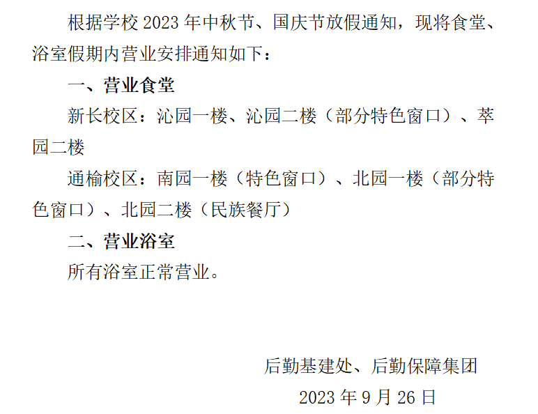 关于2023年中秋节、国庆节假期食堂浴室营业安排的通知
